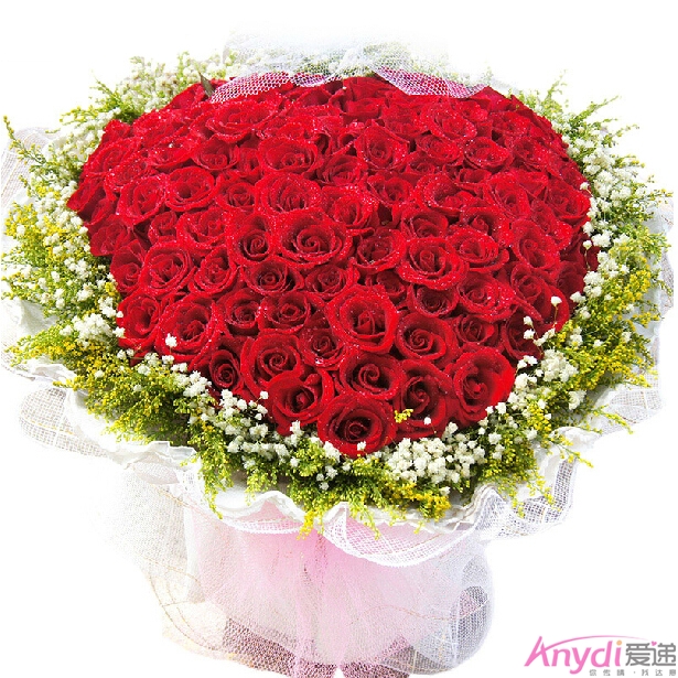 【花    材】99枝红玫瑰(心形),外围满天星、黄莺