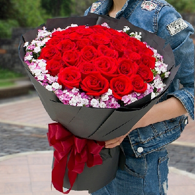 【包 装】精美图纹纸,用皱纹纸3-5层做主体包装,彩色大蝴蝶结。部分花束视情况配羽毛,小熊等。