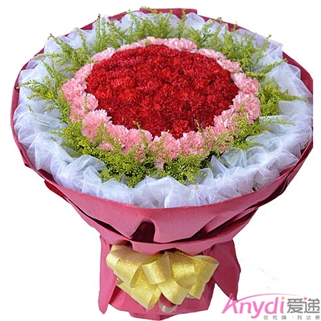 【材 料】精心粉康乃馨20枝 红康乃馨46枝,黄莺外围。