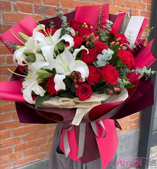 【花 材】精选15枝红康乃馨,9枝红玫瑰,精选3枝白百合(开得大的),搭配尤加利、红豆,栀子叶丰满。